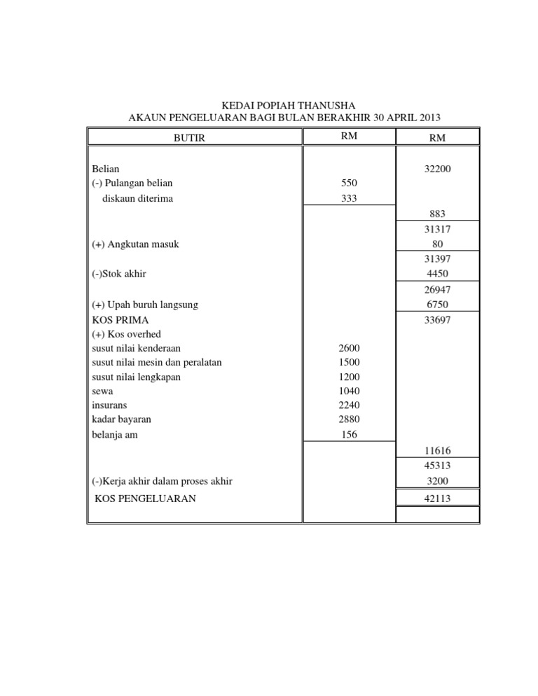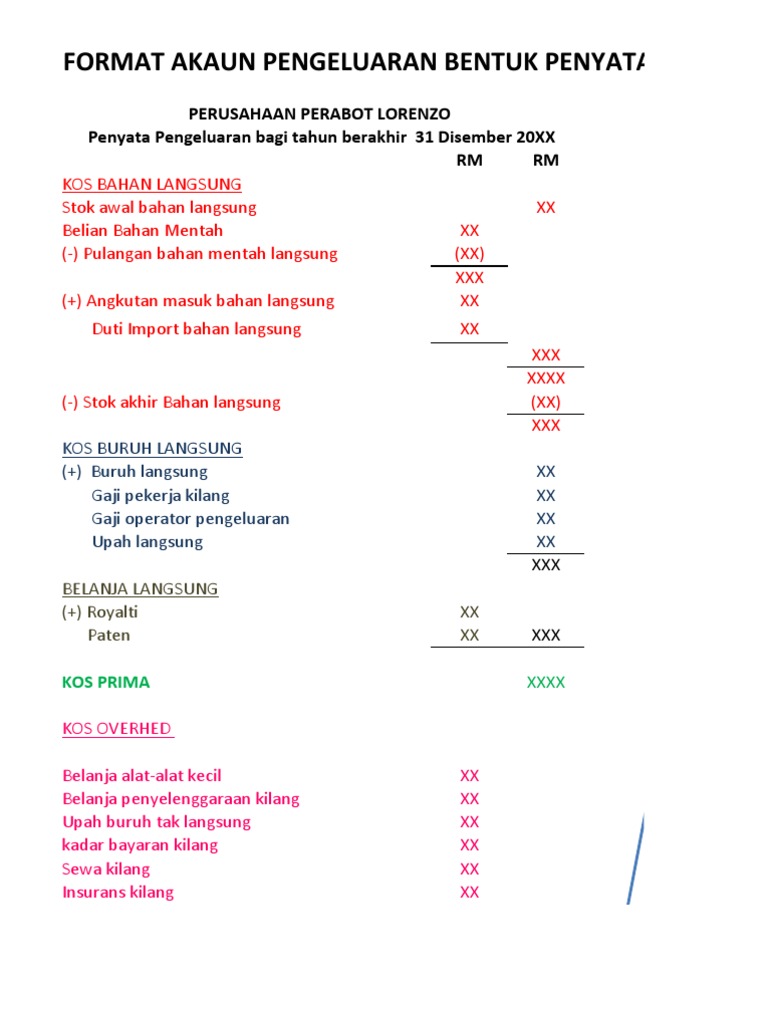 Kos Pengeluaran Format Akaun Perdagangan Nama Perniagaan Akaun Perdagangan bagi tahun berakhir RM RM X Jualan X XX tolak Pulangan Jualan XX Jualan. Kos overhed X Kadar Bayaran Kilang X Insurans kilang X Sewa kilang X Upah tidak langsung X Susut Nilai Mesin. NOTA TAMBAHAN FORMAT PENYATA KOS PENGELUARAN format 1.
